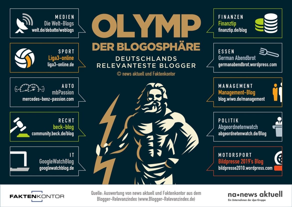 Die Blogs der Tageszeitung DIE WELT sind für die Medienbranche am relevantesten, Geldanleger lesen Finanztip und PS-Fans den Mercedes-Benz-Passion-Blog. Am erfolgreichsten im Bereich Food ist der Blog German Abendbrot, Abgeordnetenwatch steht im Bereich Politik auf Platz eins. Die dpa-Tochter news aktuell und Faktenkontor haben analysiert, welche deutschen Blogs in ihrer Branche am relevantesten sind.