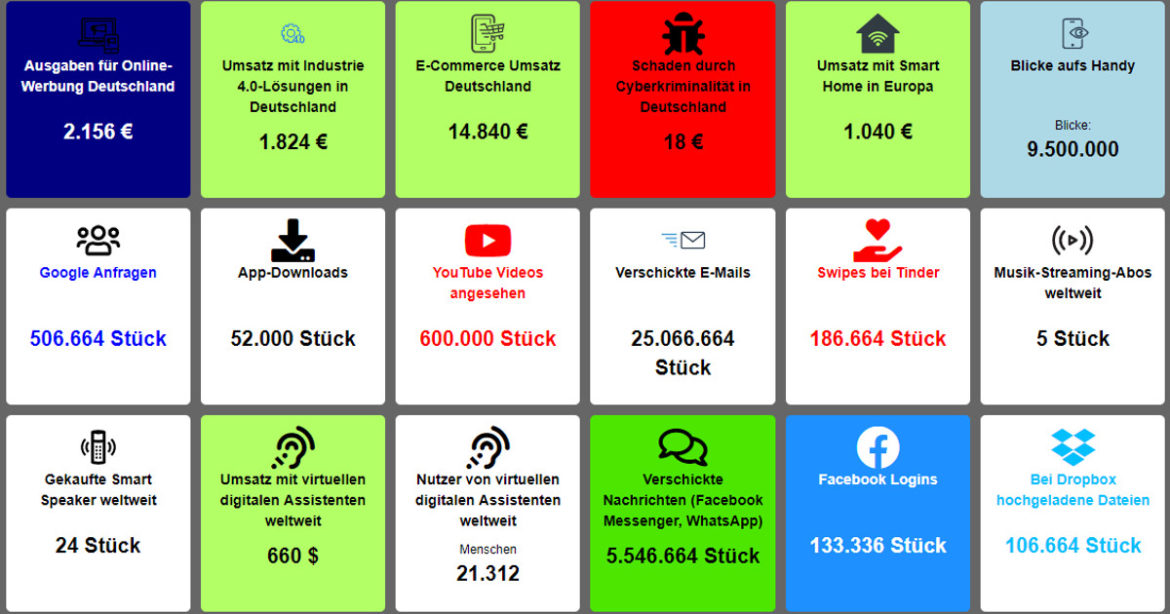 Die Grafik macht zum Beispiel erlebbar, wie viele Apps Menschen jetzt gerade herunterladen, wie oft sie bei Tinder nach links oder rechts wischen, aber auch wie viele Industrieroboter jede Sekunde gekauft werden oder wie schnell sich Schadsoftware im Netz verbreitet. Und natürlich auch, wie groß die Datenmenge ist, die bei all dem entsteht.