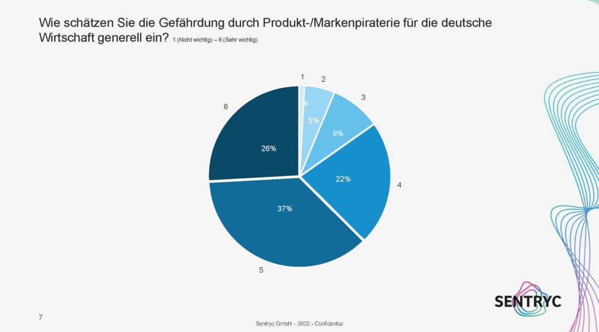 Für 54,5 Prozent der Entscheider und Entscheiderinnen zahlt die Marke und ihr Image am meisten auf den Unternehmenserfolg ein – umso höher die Angst vor Missbrauch mit wirtschaftlichen Folgen: Auf einer Skala von 1 bis 6 bewerten die Befragten die grundsätzliche Gefahr durch Plagiate für die deutsche Wirtschaft mit einer Punktzahl von 4,96. Die Gefahr für die eigene Branche stufen sie auf 4,66 ein.