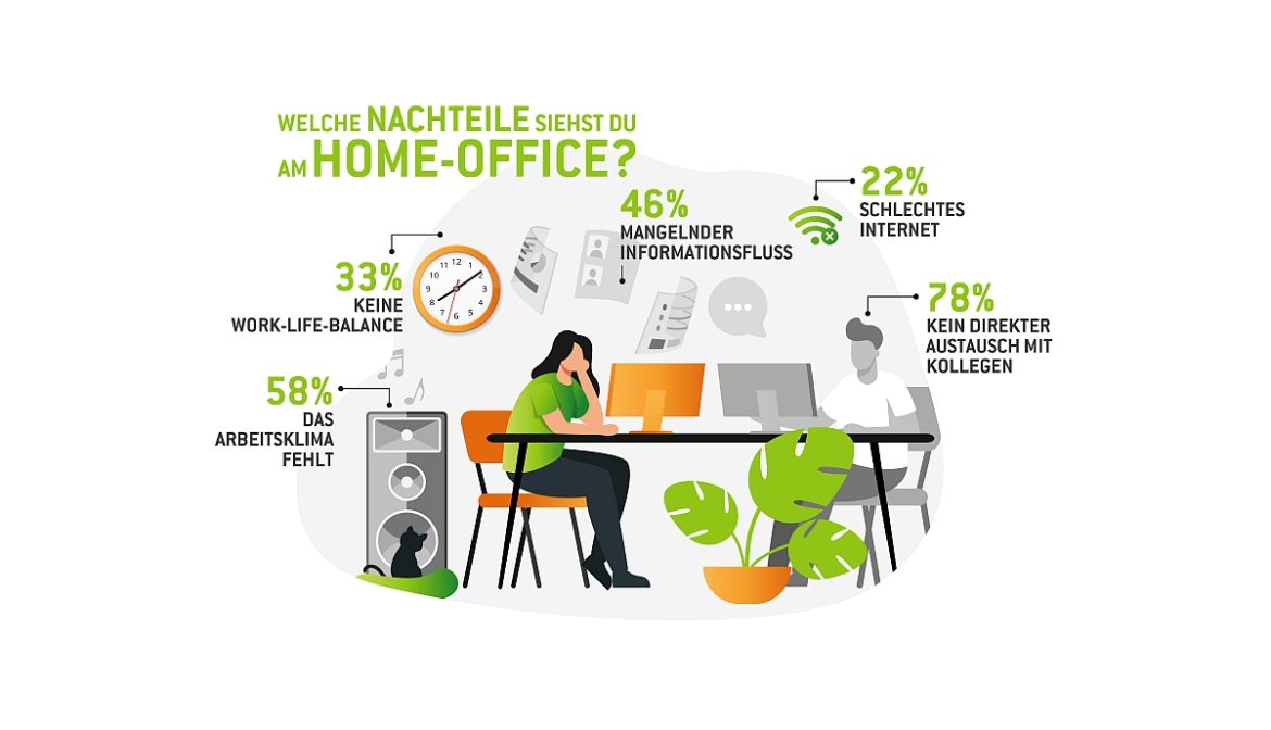 Während jeder Dritte angibt, dass die Produktivität nicht unter der derzeitigen Situation leidet, teilen sich bei insgesamt 40 Prozent der Berufstätigen die Meinungen: 21 Prozent geben an, dass sie im Home-Office produktiver sind, während 20 Prozent verstärkt abgelenkt und unkonzentriert sind. Rund ein Drittel der Teilnehmer hat das Gefühl, mehr arbeiten zu müssen, da durch die räumliche Distanz nur die Ergebnisse gesehen werden. Für jeden Vierten entstehen zusätzliche Belastungen durch die fehlende Struktur im Arbeitsalltag zuhause. Auch die Abgrenzung von Beruflichem und Privatem spielt eine große Rolle: Mehr als ein Drittel vermisst diese und meint, aufgrund dieses Aspekts auch nach Dienstschluss nur schwer abschalten zu können, was die Work-Life-Balance in ein Ungleichgewicht bringt. Während die Büroausstattung, wie Schreibtisch, Computer oder auch die Kantine, jeweils nur 15 Prozent fehlt, sehnen sich knapp ein Drittel der Umfrageteilnehmer nach der klassischen gemeinsamen „Kaffee-Pause“.