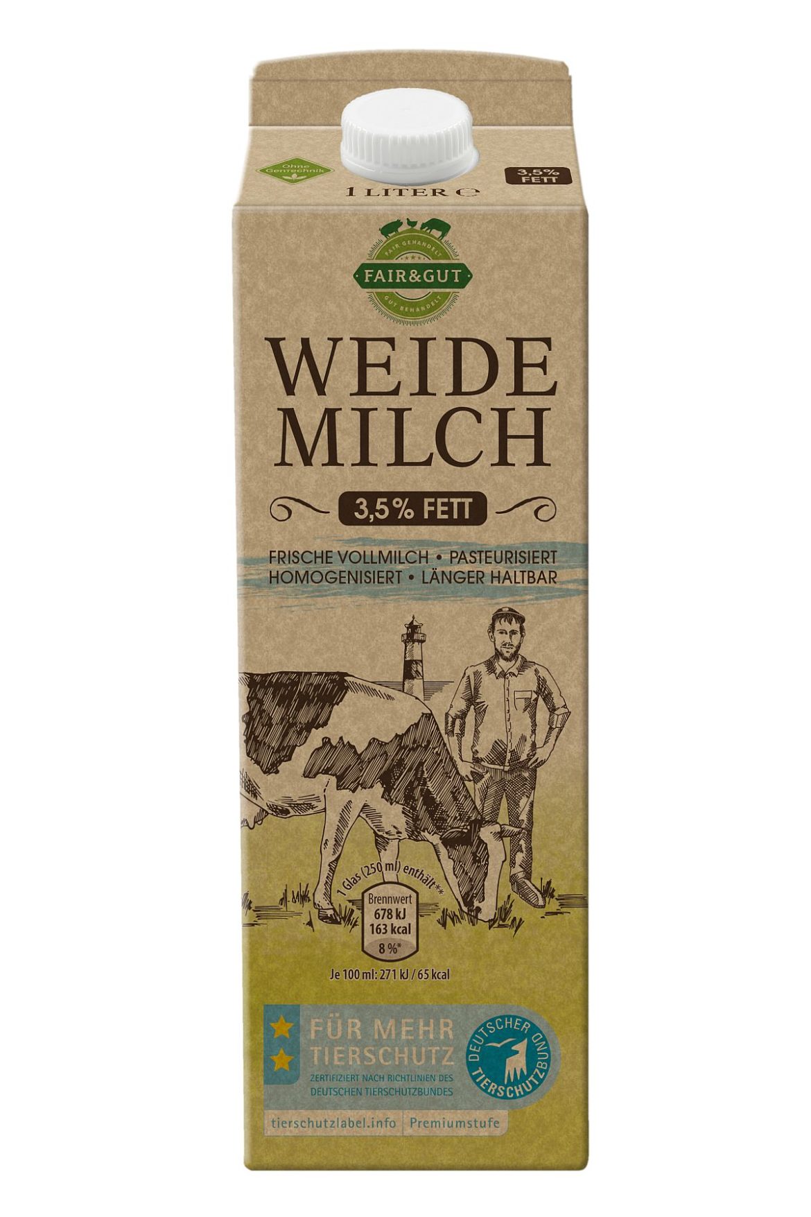 Fair gehandelt und gut behandelt: Dafür steht „Fair & Gut“ bei ALDI. Die Eigenmarke für mehr Tierwohl vereint verschiedene Standards, die über den gesetzlichen Tierhaltungsbedingungen liegen. Dazu zählen beispielsweise mehr Platz für die Tiere, Stroh im Stall, Zugang zu frischer Luft und Fütterung ohne Gentechnik. Speziell für die Weidemilch bedeutet dies unter anderem kontrollierte Weidehaltung an mindestens 120 Tagen im Jahr für täglich mindestens sechs Stunden sowie Laufstallhaltung mit großzügigem Platzangebot und ganzjährigem Zugang zum Laufhof. Bisher bezog sich das „Fair & Gut“ Sortiment der beiden Discounter auf ausgewählte Artikel aus den Bereichen Geflügel-Frischfleisch, Frischfleisch vom Schwein sowie Eier. Diese werden nach Verfügbarkeit ausschließlich in bestimmten Regionen angeboten.