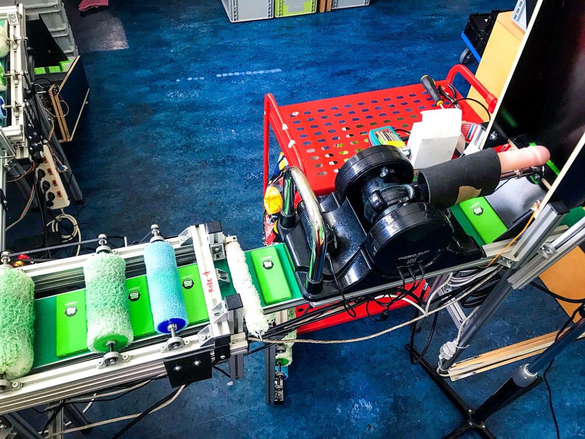 Die Investition in eine industrielle Hightech-Maschine überstiegen die Möglichkeiten des Jungunternehmens bei weitem. Deshalb hat man kurzerhand mit handelsüblichen Materialien aus dem Baumarkt selbst ein Fließband errichtet. Die Suche nach dem passenden Takter, der mit größtmöglicher Regelmäßigkeit die Powerbanks aufs Band schiebt, gestaltete sich allerdings schwierig. „Zum Glück haben wir einen Kollegen im Team, der auf die Idee mit dem Dildo kam, wahre Ingenieurskunst eben,” schwärmt Fabian Arioli.