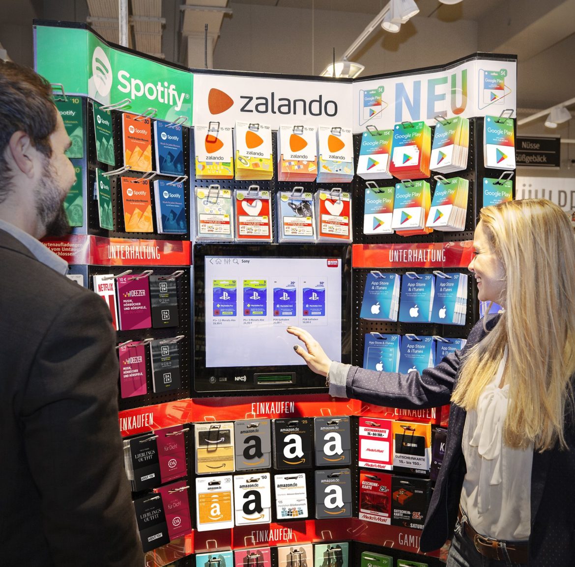 Der eKiosk bietet als Erweiterung zur klassischen Gift Card Mall dedizierten Content und zusätzliche Vertikalisierungsmöglichkeiten des Angebotes. Es ist als ein modulares System mit Touchscreen-Display, Drucker, PC inklusive Internetanschlussmöglichkeiten, 2D-Scanner, NFC und Bluetooth aufgebaut. So ausgestattet, ermöglicht er eine bisher nicht da gewesene Flexibilität und Schnelligkeit in der Kundenansprache sowie schnelle Anpassungsfähigkeit an Kundenbedürfnisse. Mittels intuitiver Benutzerführung bietet er umfangreiche Informationen für Kunden, die mit maximal drei Klicks zum gewünschten Produkt gelangen und sich dank des Designs analog zur Rewe-Kartenwelt sehr schnell zurechtfinden. Die zentrale Steuerung der Aktionen reduziert erheblich die Aufwände für alle Beteiligten. Promotion-Aktionen und zeitlich begrenzte Angebote lassen sich kurzfristig und erstmalig auf regionale Bedürfnis- und Nachfragestrukturen in den angeschlossenen Märkten ausrichten.