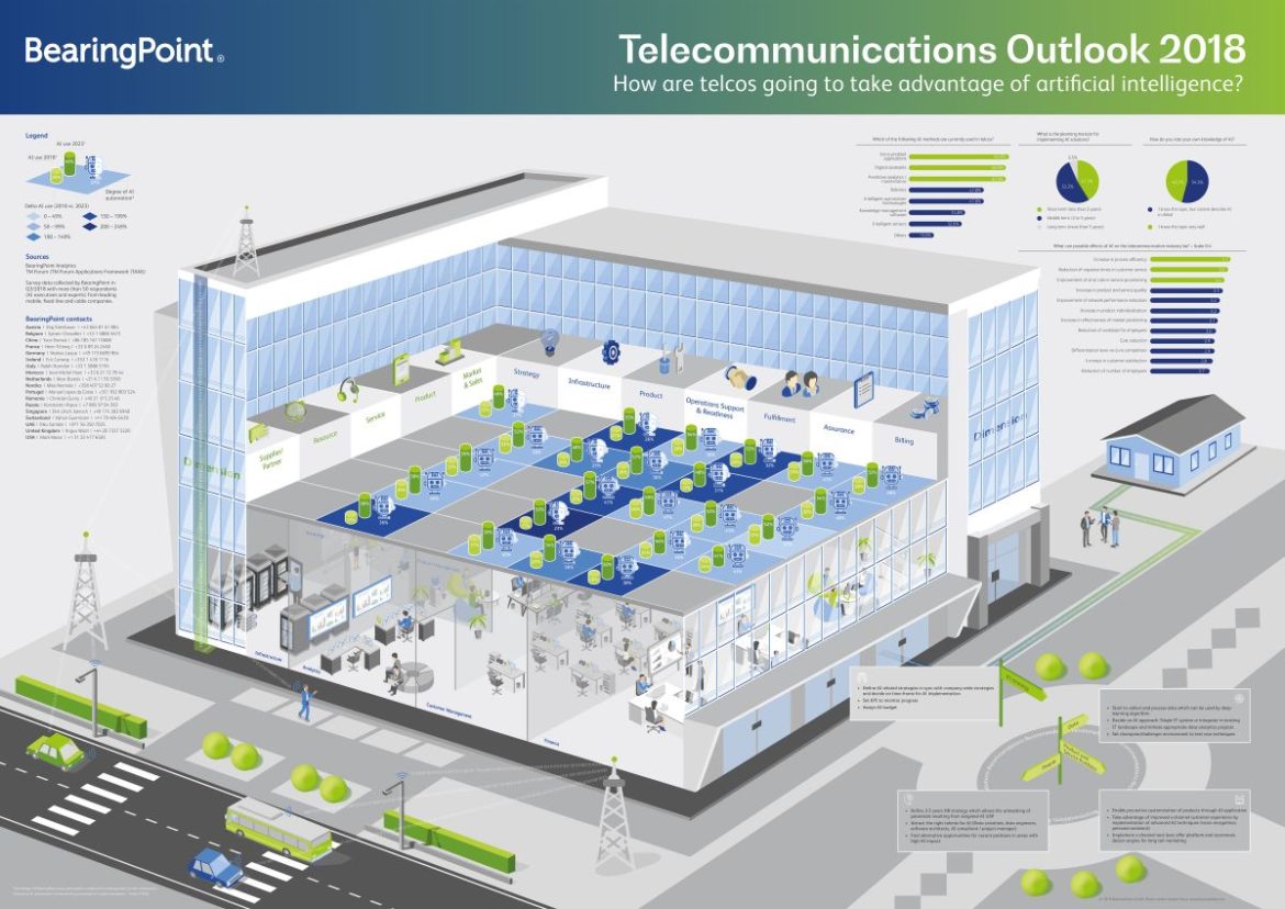 In den letzten Jahren hat Künstliche Intelligenz (KI) in Form von Sprachassistenten wie Alexa, Siri oder Google Assistant zunehmend Einzug in den Alltag von Verbrauchern gehalten. Die Technologien dahinter entwickeln sich stetig weiter und bieten auch für das B2B Umfeld großes Potenzial. Analysten prognostizieren vielfältige Verwendungsmöglichkeiten von KI in allen funktionellen Unternehmensbereichen – so auch für die Telekommunikationsbranche. Diese Entwicklung hat BearingPoint zum Anlass genommen, eine internationale Studie unter Experten und Unternehmensvertretern von Telekommunikationsnetzbetreibern zum derzeitigen und zukünftigen Einsatz von KI durchzuführen. In Anlehnung an das vom TeleManagement Forum entwickelte Rahmenkonzept wurde der KI-Einsatz in den funktionalen Bereichen von Telekommunikationsunternehmen sowie den damit verbundenen Zielen, Methoden und Effekten untersucht. Die Untersuchung zeigt, dass die Nutzung von KI in der Telekommunikationsbranche bereits weit verbreitet ist.