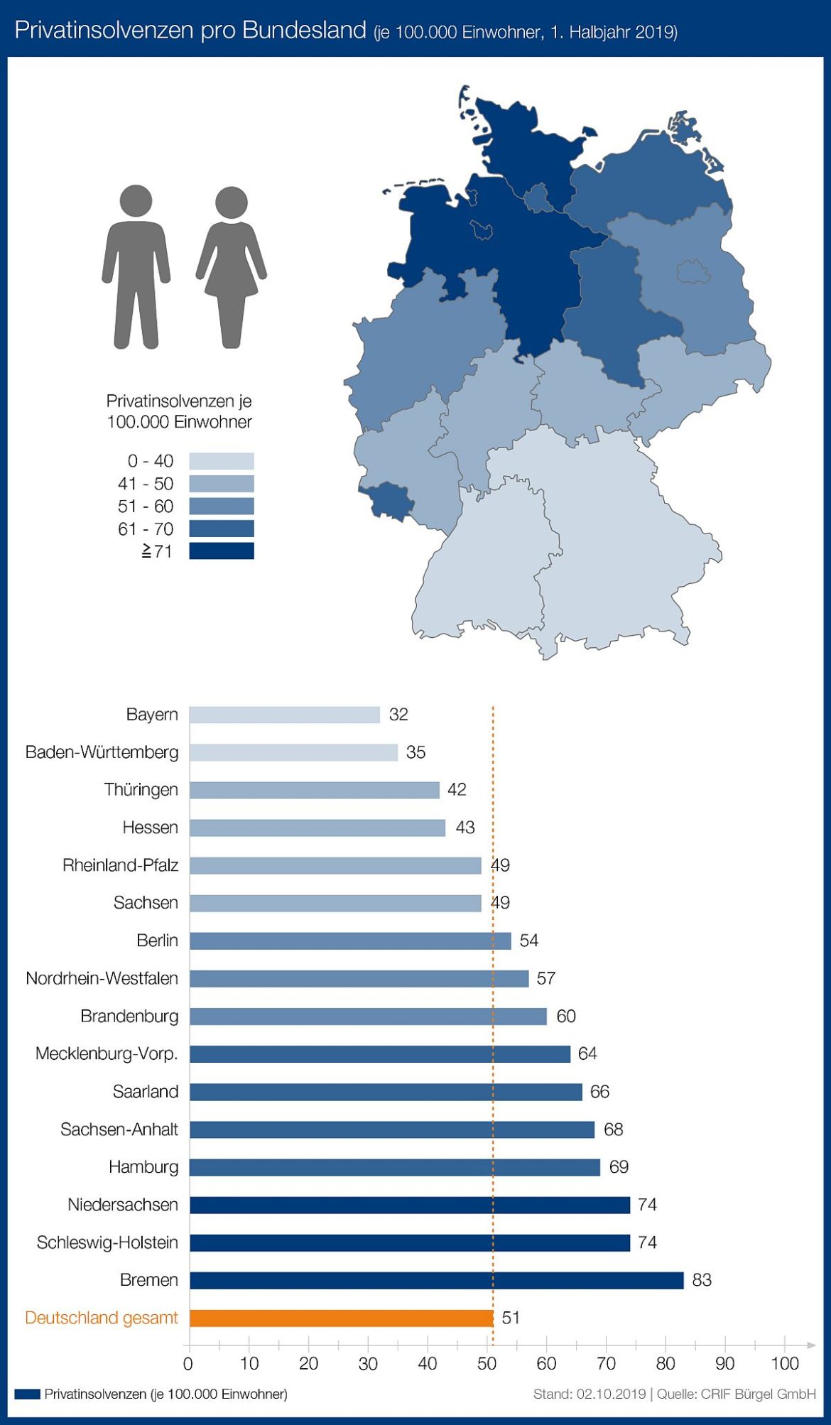 Ein Trend bei den Privatinsolvenzen setzt sich auch im 1. Halbjahr 2019 fort: Der Norden bleibt die Insolvenzhochburg in Deutschland. Am meisten Privatpleiten gab es in den ersten sechs Monaten in Bremen. Auf 100.000 Bürger gerechnet waren 83 zahlungsunfähig. Es folgt ein Nord-Süd-Gefälle: Die weiteren Insolvenzspitzenreiter sind Schleswig-Holstein und Niedersachsen mit je 74 Privatinsolvenzen je 100.000 Einwohner und Hamburg (69). Der Bundesdurchschnitt liegt im 1. Halbjahr 2019 bei 51 Privatinsolvenzen je 100.000 Einwohner. Über dem Schnitt rangieren auch die Bundesländer Sachsen-Anhalt (68), Saarland (66), Mecklenburg-Vorpommern (64), Brandenburg (60), Nordrhein-Westfalen (57) und Berlin (54). Am wenigsten Privatinsolvenzen meldeten im 1. Halbjahr 2019 Bayern (32 Fälle je 100.000 Einwohner), Baden-Württemberg (35) und Thüringen (45).