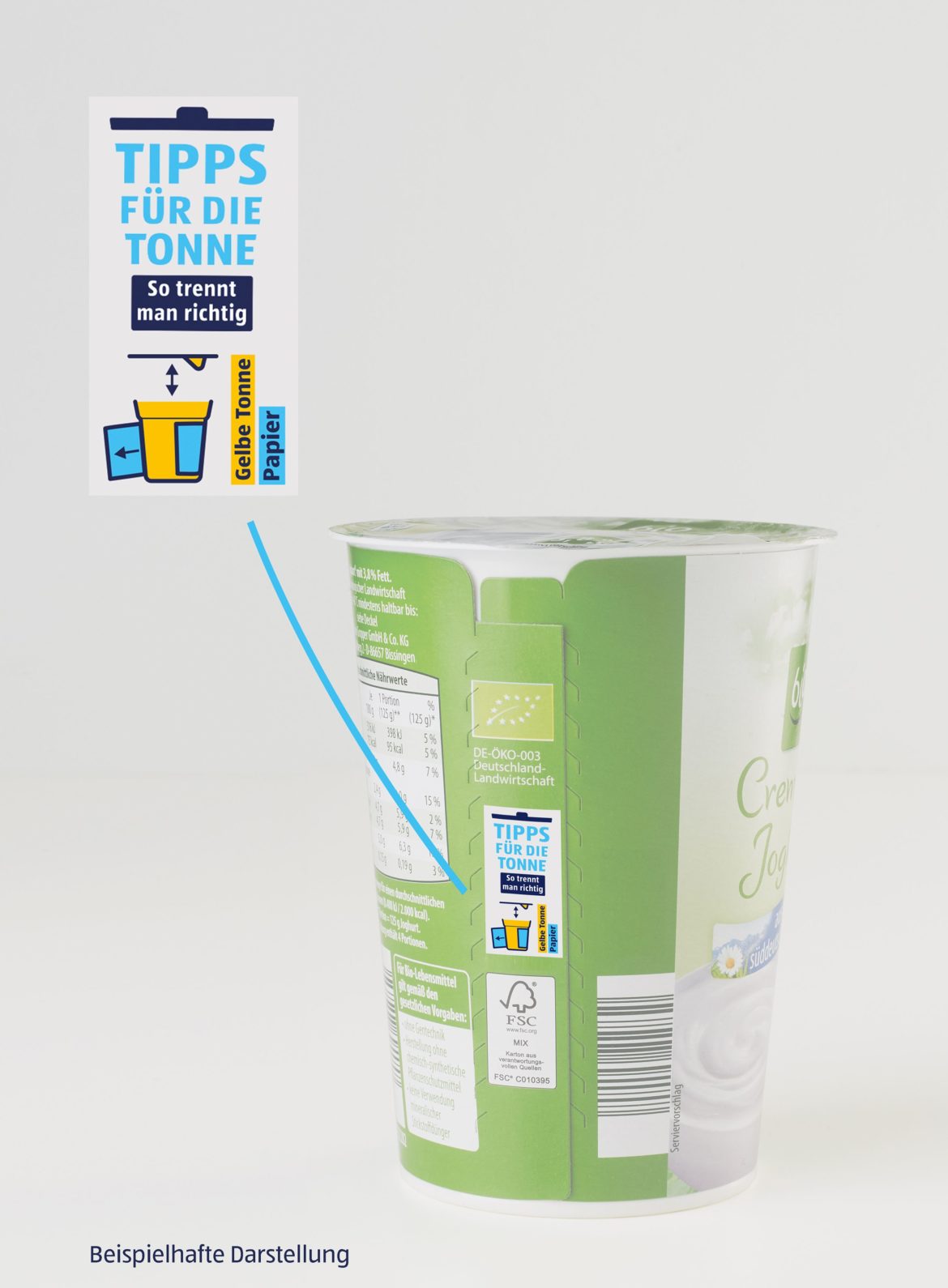 Bei bestimmten Produktverpackungen sind Besonderheiten bei der Auswahl des richtigen Entsorgungsweges zu beachten. Das gilt vor allem für Verpackungen, die aus unterschiedlichen Materialien bestehen. Daher demonstrieren selbst erklärende Grafiken auf ausgewählten Verpackungen Schritt für Schritt, wie diese richtig getrennt und entsorgt werden. Dies lässt sich am Beispiel des Bio-Joghurtbechers veranschaulichen: Der Becher besteht aus Kunststoff, der Deckel aus Aluminium und bei der Banderole handelt es sich um Papier. Werden die drei Komponenten nicht voneinander getrennt, lassen sie sich anschließend nicht richtig recyceln. Daher sollte der Deckel immer vom Becher abgetrennt in der gelben Tonne entsorgt werden. Die Banderole gehört in die Papier-Tonne.