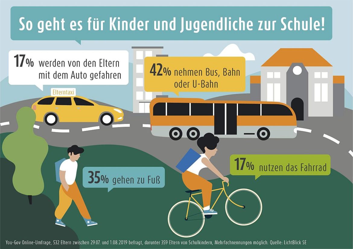 In den ersten Bundesländern enden die Sommerferien, das neue Schuljahr startet und viele Eltern machen sich Gedanken darüber, wie ihre Kinder sicher zur Schule gelangen können. Auch der Umweltschutz spielt dabei eine Rolle. Laut einer repräsentativen Umfrage des Marktforschungsinstitut YouGov im Auftrag des Ökostromanbieters LichtBlick, schicken 42 Prozent der Eltern ihre Kinder umweltschonend mit öffentlichen Verkehrsmitteln (Bus, Bahn oder U-Bahn) zur Schule – 35 Prozent haben angegeben, dass ihre Kinder zu Fuß zur Schule kommen, 17 Prozent nutzen das Fahrrad.