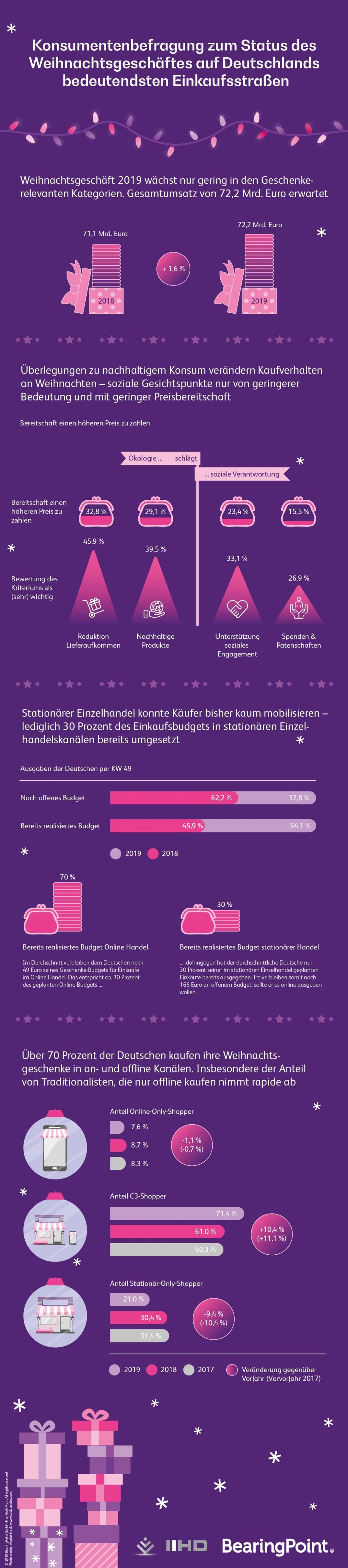 Deutsche Kunden kaufen ihre Weihnachtsgeschenke immer später und geben deutlich weniger Geld aus als noch 2018. Das ist das Ergebnis einer Konsumentenbefragung von BearingPoint und dem IIHD Institut zum Status des diesjährigen Weihnachtsgeschäfts auf Deutschlands meist frequentierten Einkaufsstraßen. Während der Online-Handel boomt, hat der stationäre Handel weiter mit Einbußen zu kämpfen.