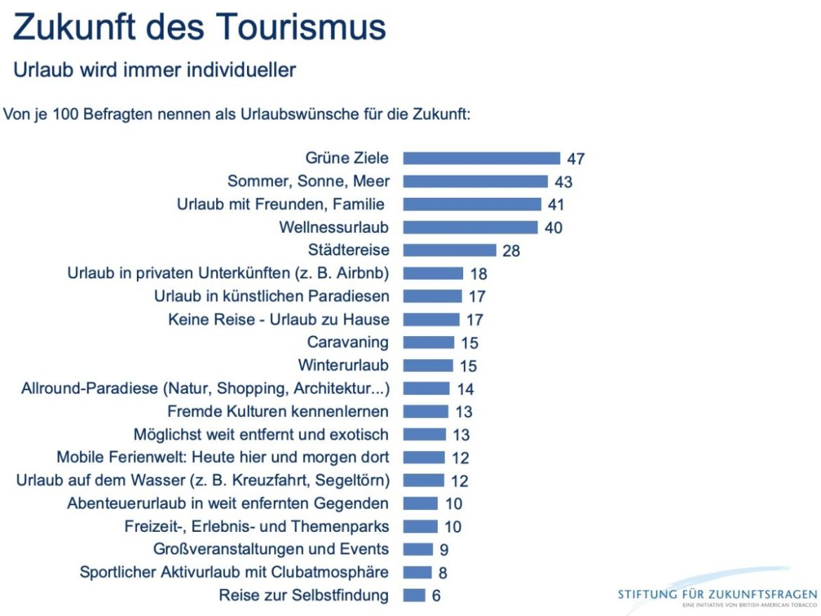 Die Individualisierung des Urlaubs setzt sich fort. Auch wenn der Anteil von Pauschalreisen gegenwärtig sehr hoch ist, wollen immer mehr Reisende ihren Urlaub auf ihre ganz eigenen, speziellen Wünsche und Bedürfnisse anpassen. Der Reisende der Zukunft hat multiple Urlaubsidentitäten und passt seinen Urlaub seiner Lebenssituation und Stimmung an. Traditionelle Urlaubsformen sterben hierbei nicht aus, werden aber zunehmend erweitert und ergänzt. Entsprechend ausdifferenziert soll und muss das Angebot der Reisebranche in Zukunft werden, um es den Urlaubern zu ermöglichen ihre Reise nach ihren ganz persönlichen Vorlieben zu gestalten.